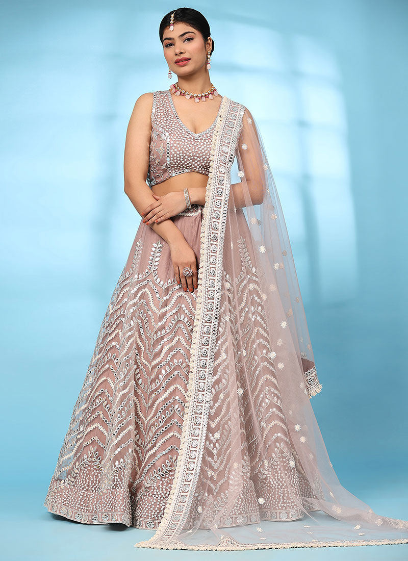 Rose Pink Embroidery Wedding Lehenga Choli With Dupatta is an absolute beauty as an indian wear for wedding ceremonies. This elegant set has traditional lucknowi embroidery detailed with white resham thread, silver gota patti and all over sequence work on premium net lehenga with satin and can-can layered lining paired with equally embellished premium net blouse. The beauty of this set is embroidery border and butti work enhanced soft net dupatta. Team this designer attire with classic pair of heels and golden jewellery to look like a diva.