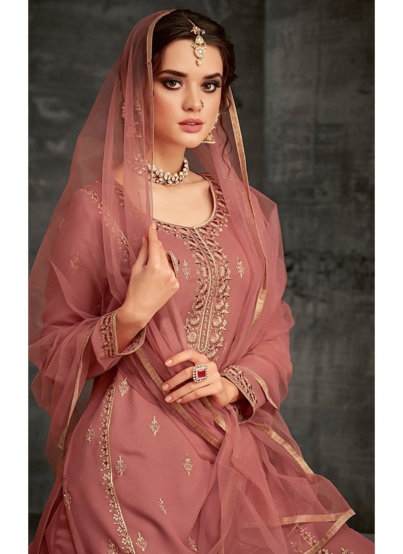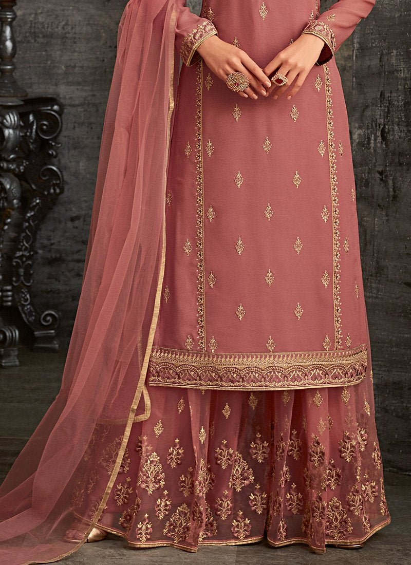 Rustic Red Ethnic Embroidered Palazzo Suit will mesmerise rest of the crowd with your ethereal ethnic glow by wearing this set with beautiful top fully embellished with zari buttis and resham kari embroidery work on satin georgette fabric paired with designer embroidered net gharara palazzo bottom with santoon added lining and lace bordered net dupatta. This set can be teamed up with a pair of golden heels and traditional jhumkas.