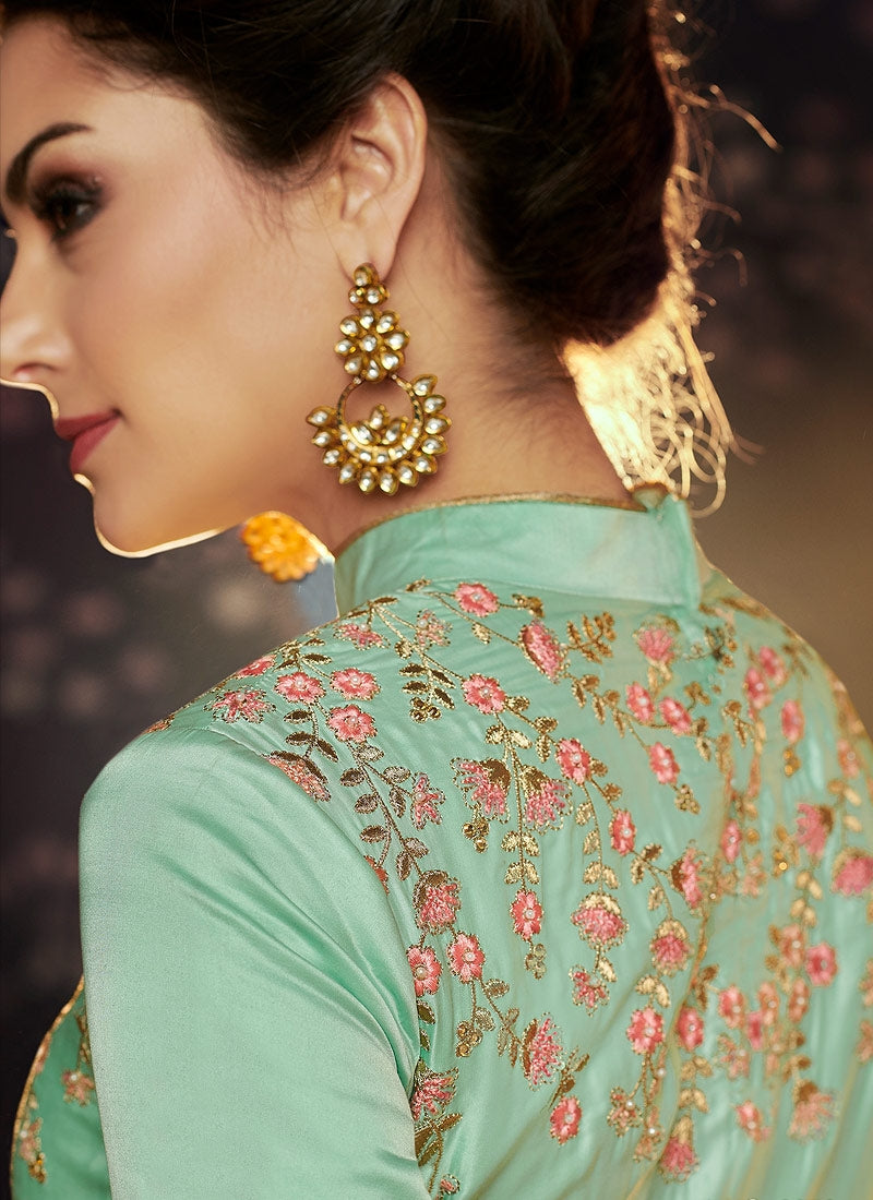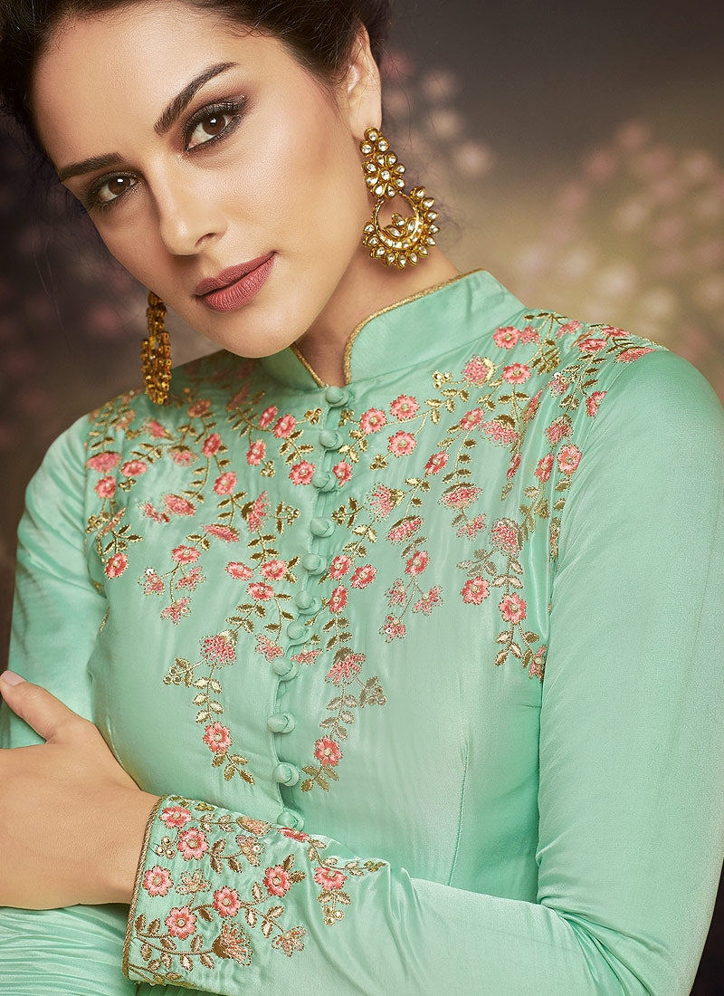 Sea Green Double Layered Embroidered Anarkali Suit is especially crafted for showcasing glamorous style and ethnic elegance with its unique embroidered combination of zari, thread and reshamkari embroidered on satin silk floor length anarkali gown that can be styled on cocktail parties as well as on wedding event paired with bordered pure chiffon dupatta. Team this set with fancy stilettos and statement jewellery to glam up your evening.