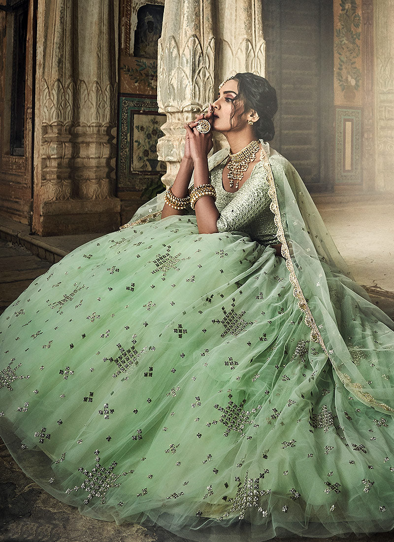 Sea Green Designer Lehenga Choli In usa uk canada. Shop Latest Indian Clothes Collection Of Sea Green Designer Lehenga Choli Online In Australia, Newzeland. This elegant set has a very pretty thread embroidery detailed with zarkan, zari and sequence work on soft net lehenga with satin lining paired with equally embellished silk choli and ethnic embroidery bordered net dupatta. Team this beautiful attire with classic pair of heels and golden jewellery to look like a diva.
