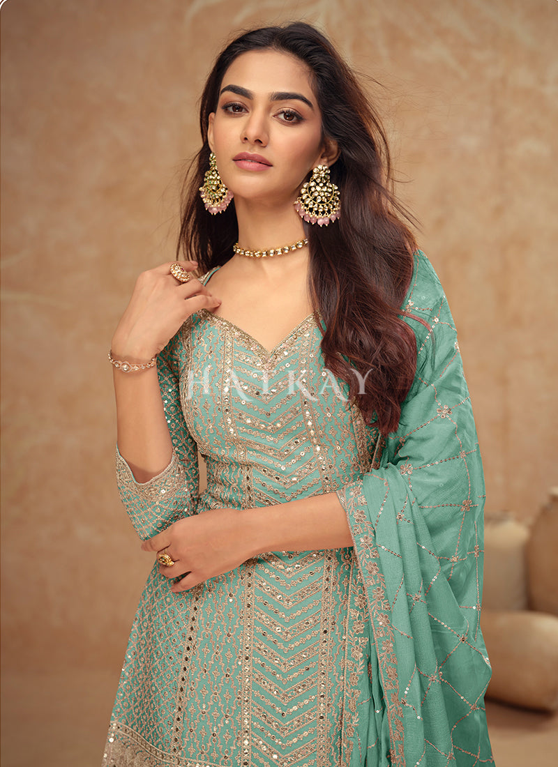 Sea Green Pakistani Sharara Suit is specially crafted for this festive season with delicate embroidery details, accented perfectly with golden reshamkari zari and sequins work all over the straight-cut premium chinnon top, paired with a heavy ghera-embellished premium chinnon flared sharara bottom. This set also includes a heavy zari embroidery-enhanced shimmering chinnon dupatta. Style it gracefully this wedding/festive season with studded earrings and stylish heels.