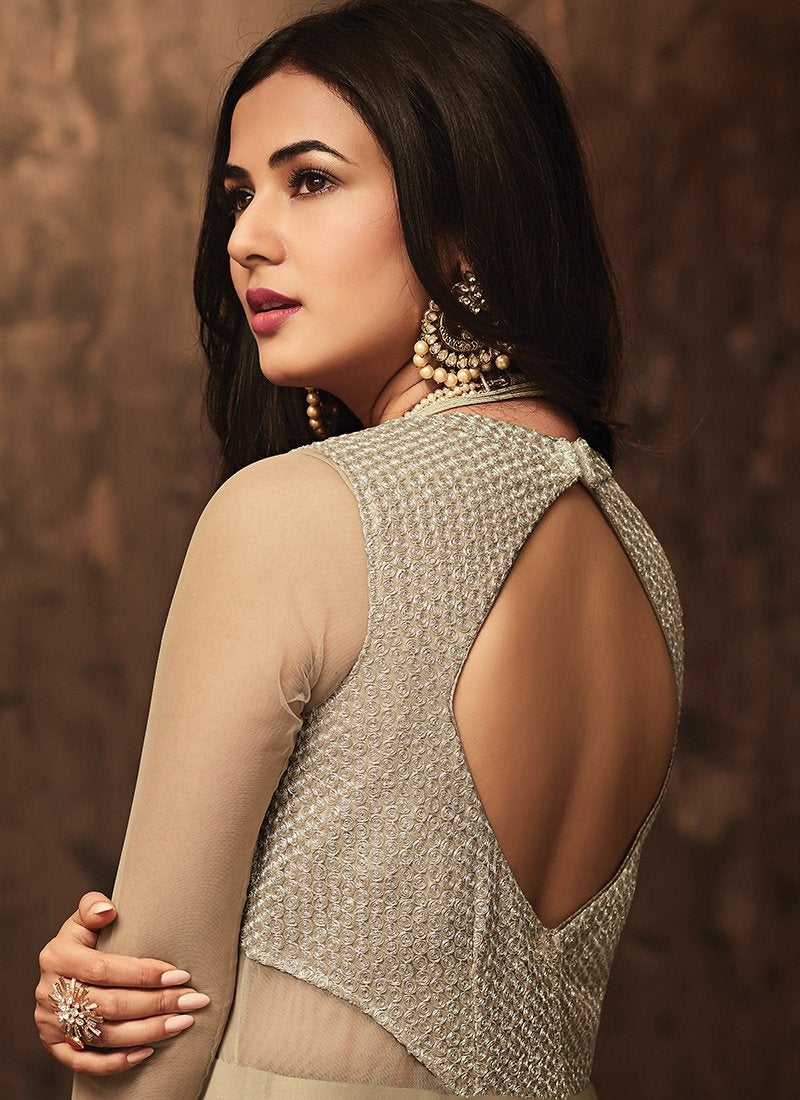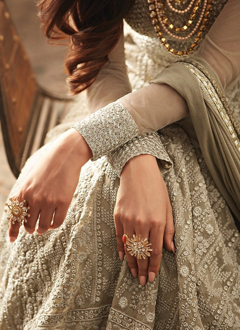 Silvery Grey Hues With Rustic Embroidered Detail Flared Kaliyaari Anarkali Suit Set
