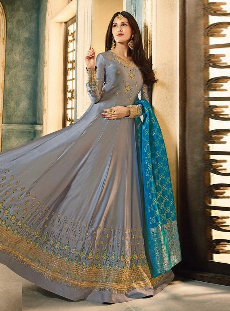 Slate Grey And Blue Motif Embroidered Ghera Anarkali Suit is especially crafted for showcasing glamorous style and ethnic elegance with its unique motifs embroidered combination of beautiful zari and thread work annotated perfectly on flared satin georgette anarkali top with border detail. This set accompanies with santoon bottom and digital printed banasi jacquard dupatta. Style it gracefully with studded earrings and stylish heels on this festive season.