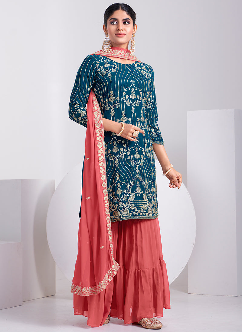Teal Blue And Peach Embroidery Festive Sharara Style Suit