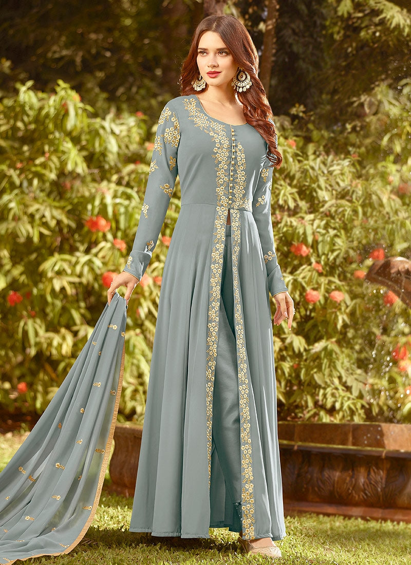 Teal Blue Golden Embroidered Slit Style Anarkali Suit will indulge you to look more beautiful on this wedding season with its alluring beauty. This set comprises of ethnic zari and resham-kari embroidered slit style fancy georgette top paired with matching santoon bottom and lining and embellished georgette dupatta. Style this set with juttis and fashion jewellery to look stunning with all bridal drama.
