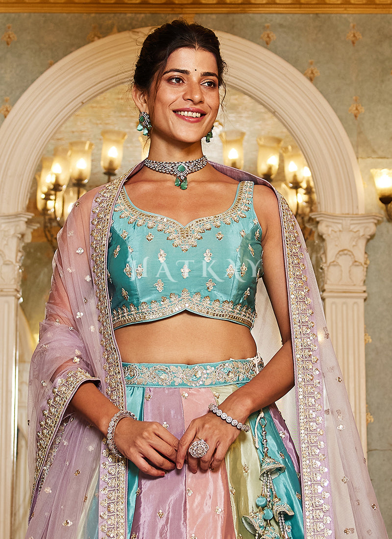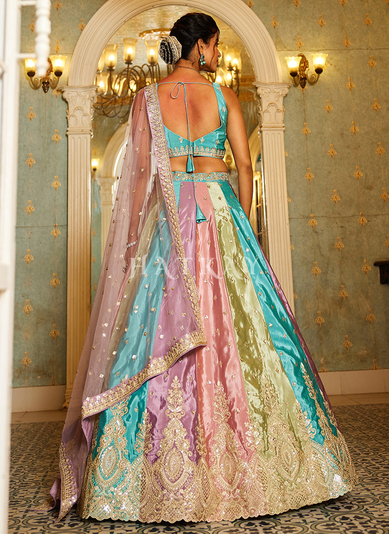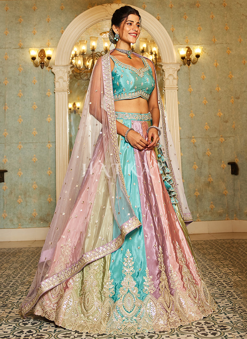 Teal Blue Multicolored Embroidered Bridal Lehenga Choli, is elegantly crafted from luxurious premium satin silk fabric. The lehenga features a harmonious blend of lime green, blush pink, and teal blue panels, adorned with exquisite golden zari, sequins and beads work embroidery. The choli, in matching teal blue, is embellished with intricate detailing that complements the overall design. The dupatta, in a soft blush pink, adds a layer of grace and sophistication. Perfect for festivals and bridal occasions, this set can be paired with statement jewelry and heels for a timeless and radiant appearance.