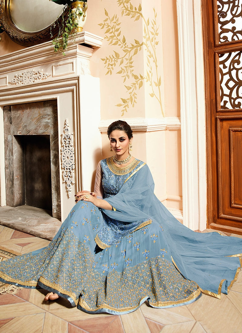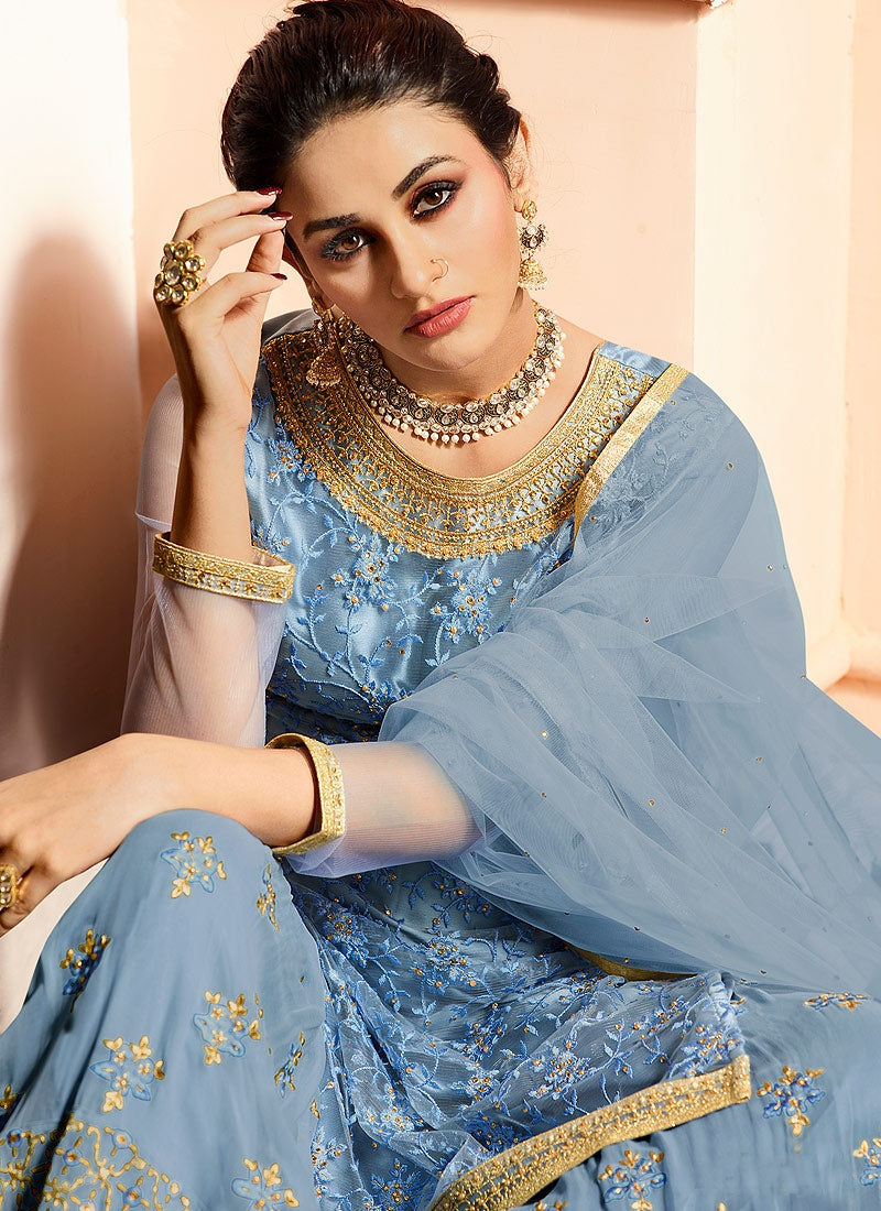 Teal Blue With Golden Touch Embroidered Gharara Suit features very intrinsic designer embroidery over its soft net top paired with matching layered ghera embroidered georgette gharara bottom and bordered net dupatta. The dress accompanies with matching heavy japan satin lining for top and bottom. Wear this to bright up your wedding parties or any social event with heels and jewellery to look best from rest of the crowd.