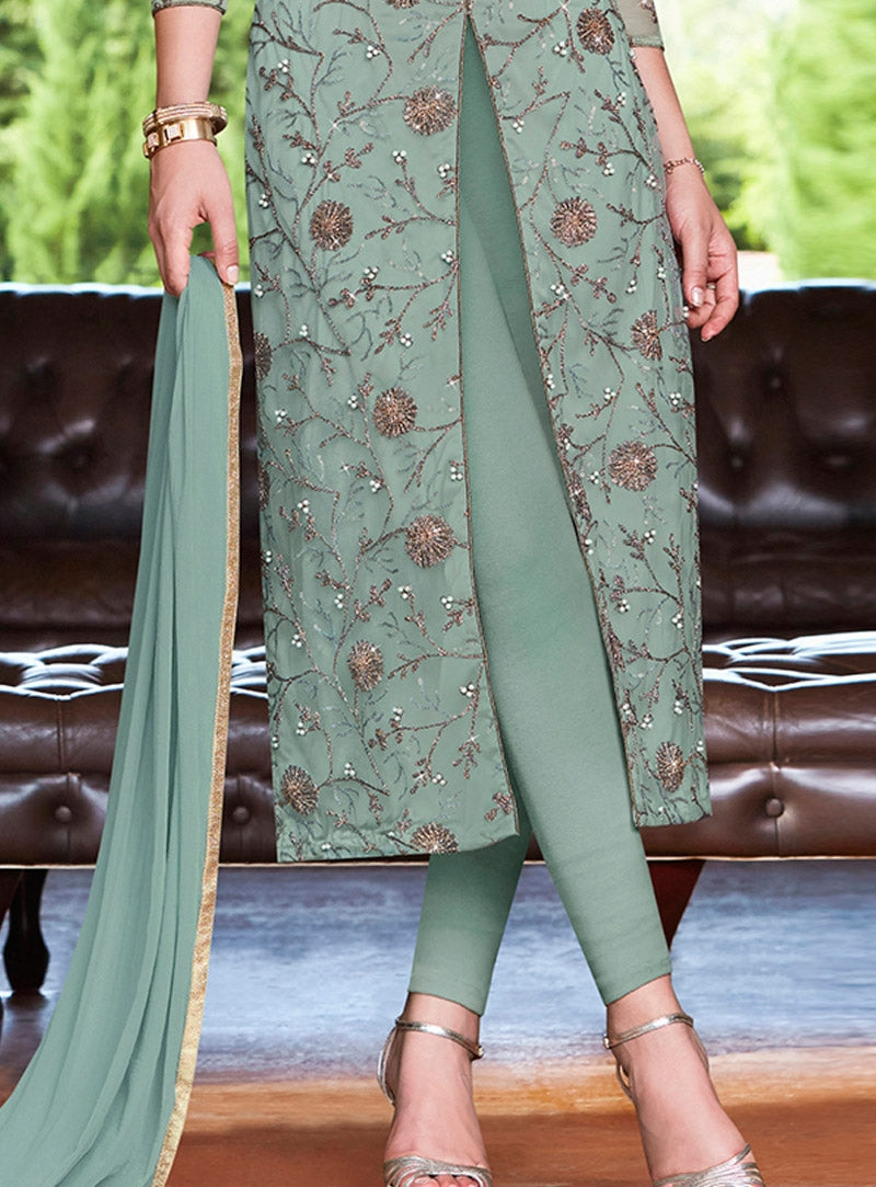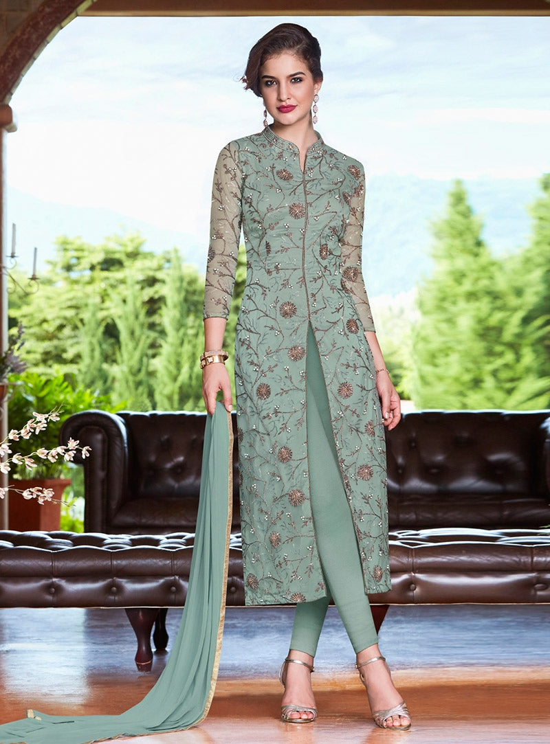 Teal Overall Designer Embroidered Lehenga Kurti Set work with minimalist modern art detail annotated beautifully with the combination of resham zari, thread and stone work on its slit style net top paired with matching embellished lehenga/pant bottom and satoon inner and bordered chiffon bordered dupatta. Style this very pretty attire on any wedding or festival party with heels and jewellery to look stunningly beautiful from the rest of the crowd.