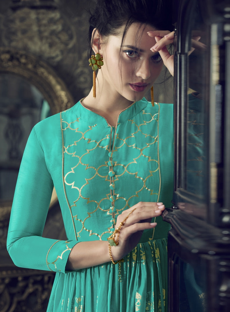 Turquoise And Golden Embroidered Flared Anarkali Suit