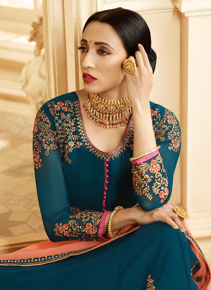 Turquoise And Orange Ethnic Embroidered Flared Anarkali Suit is especially crafted for showcasing glamorous style and ethnic elegance with its unique embroidered combination of zari and resham thread work annotated perfectly on flared georgette top with satin layered lining. This set accompanies with matching santoon bottom and bordered nazmine chiffon dupatta. Style it gracefully with studded earrings and stylish heels.