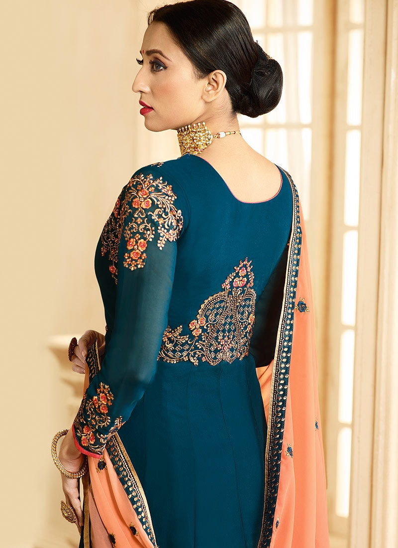 Turquoise And Orange Ethnic Embroidered Flared Anarkali Suit