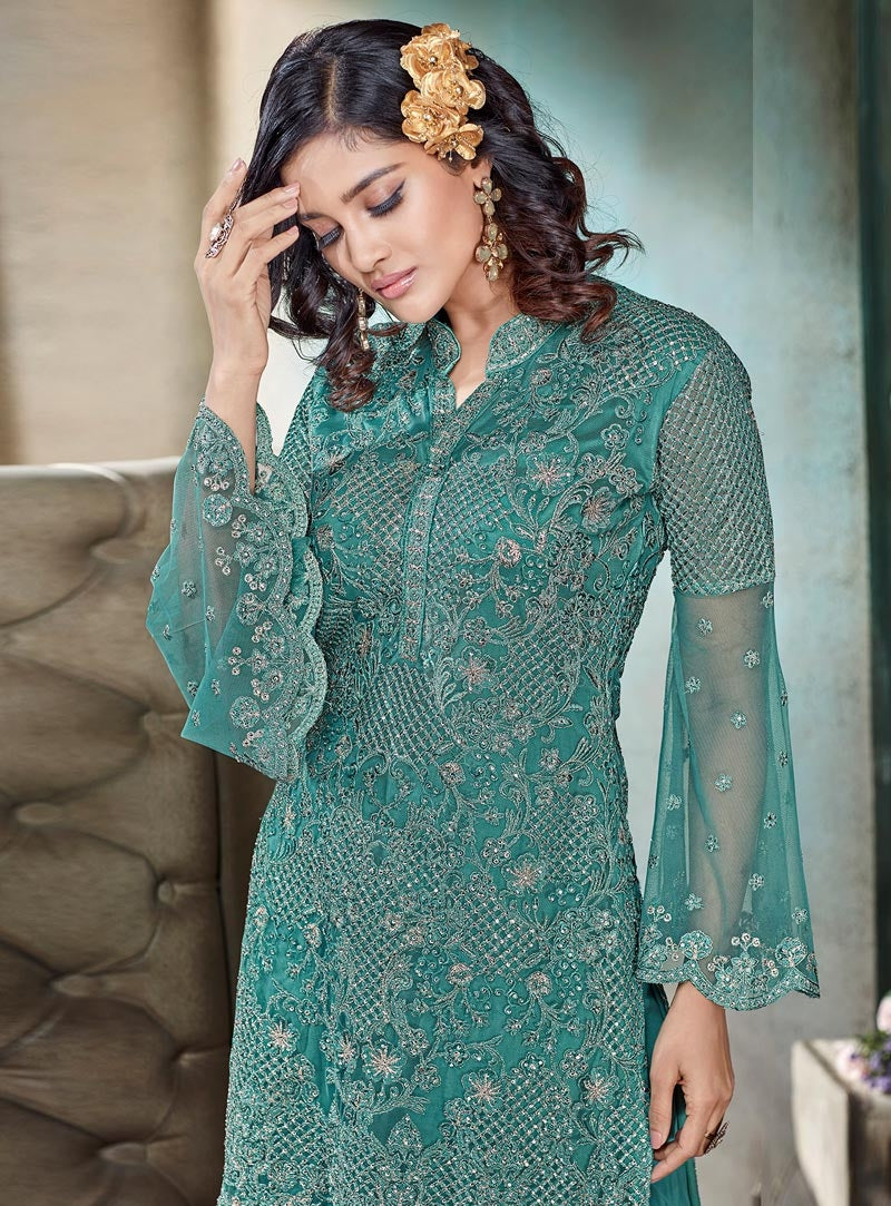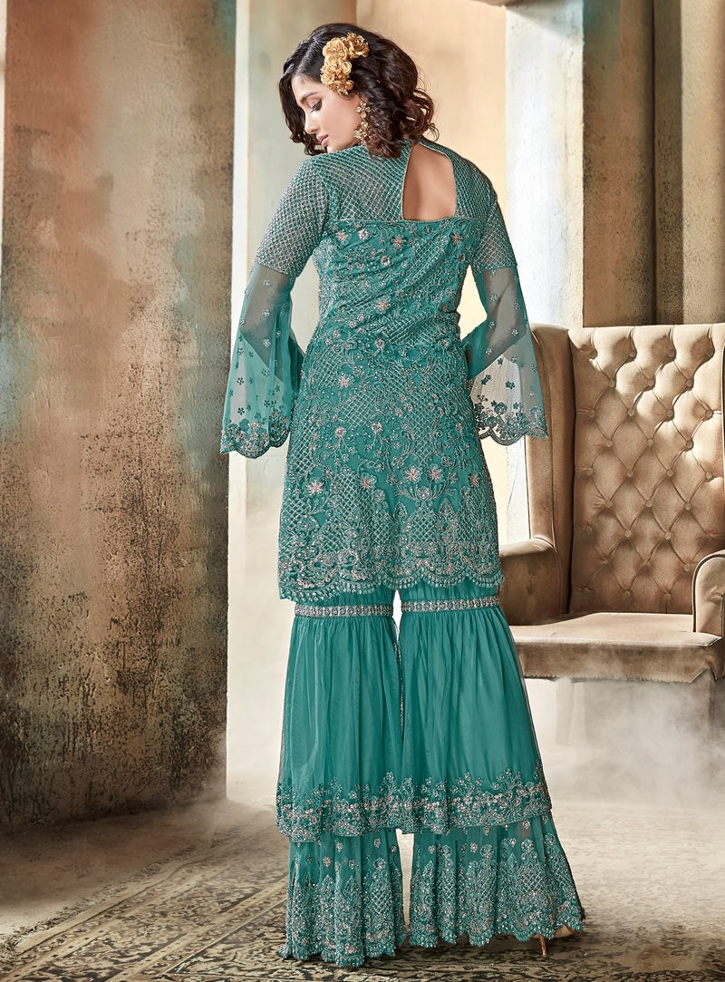 Turquoise Blue Embroidered Layered Style Gharara Suit