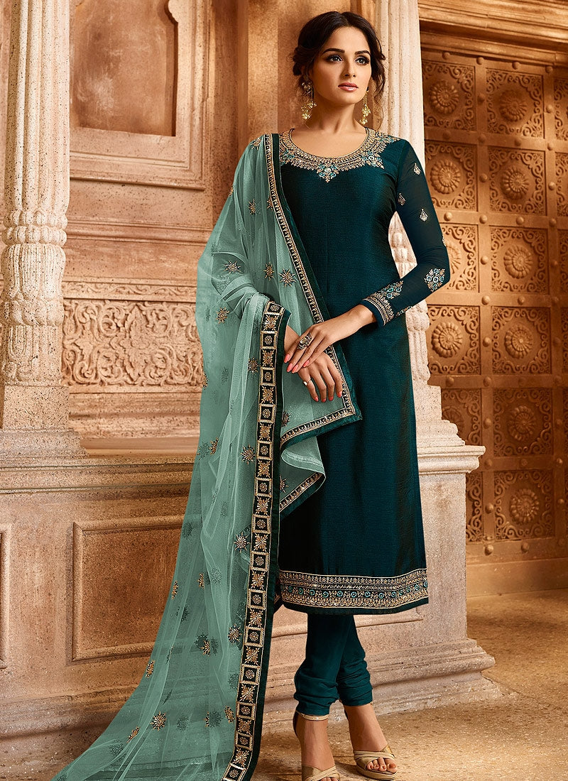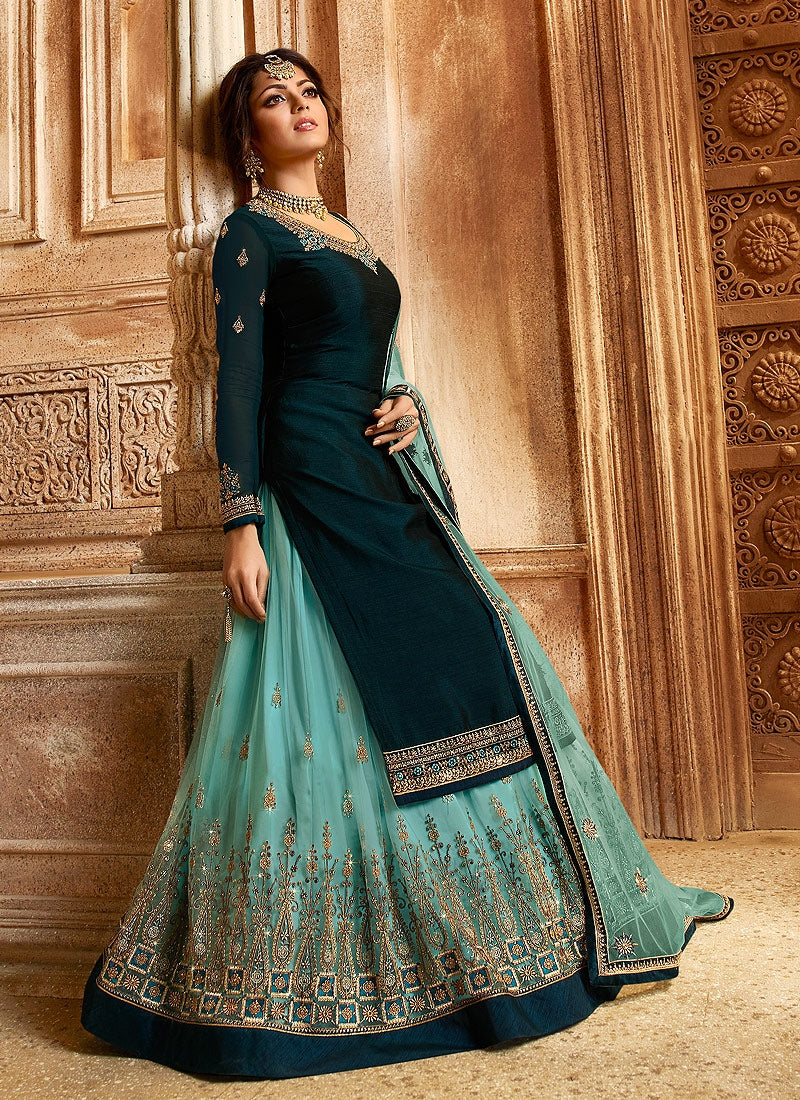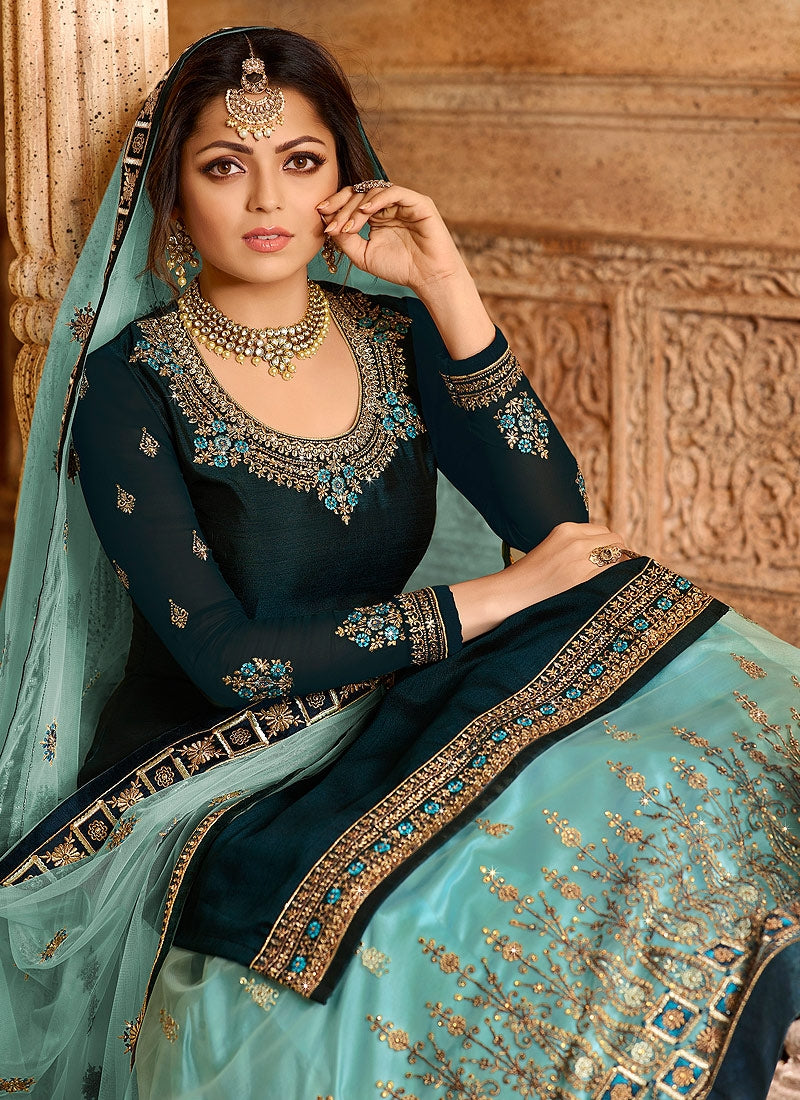 Turquoise Blue Two Tone Dual Bottom Lehenga/Pant Kurti Set is especially crafted for showcasing glamorous style and ethnic elegance with its unique embroidered combination of zari and resham thread work annotated perfectly on straight cut satin georgette top with santoon lining and flared georgette layered embroidered lehengha. This set also accompanies with matching santoon pant bottom and embroidered cut work net dupatta. Style it gracefully with studded earrings and stylish heels.