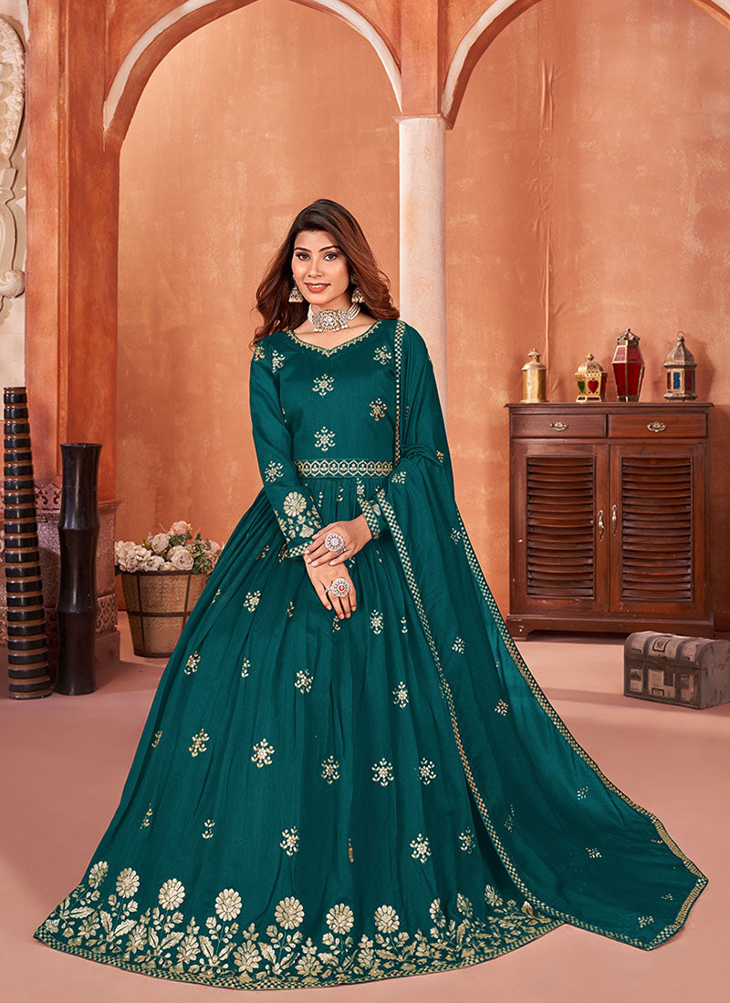 Turquoise Embroidery Silk Anarkali Suit will bring out the best in you on this wedding season with its exclusive karigiri. This suit set features beautiful resham thread and sequence work on art silk anarkali top paired with classic santoon pants bottom and lining. The beauty part of this suit is border and butti embroidery enhanced art silk dupatta. Team up golden jewellery and stilettos with this suit set to fetch you a lots of compliments and glances.