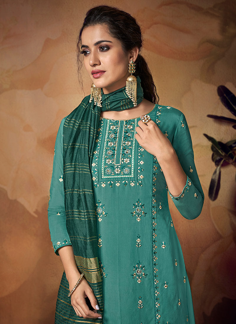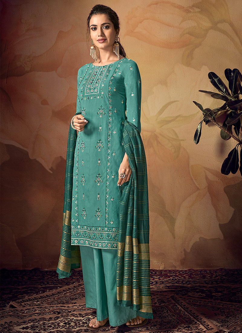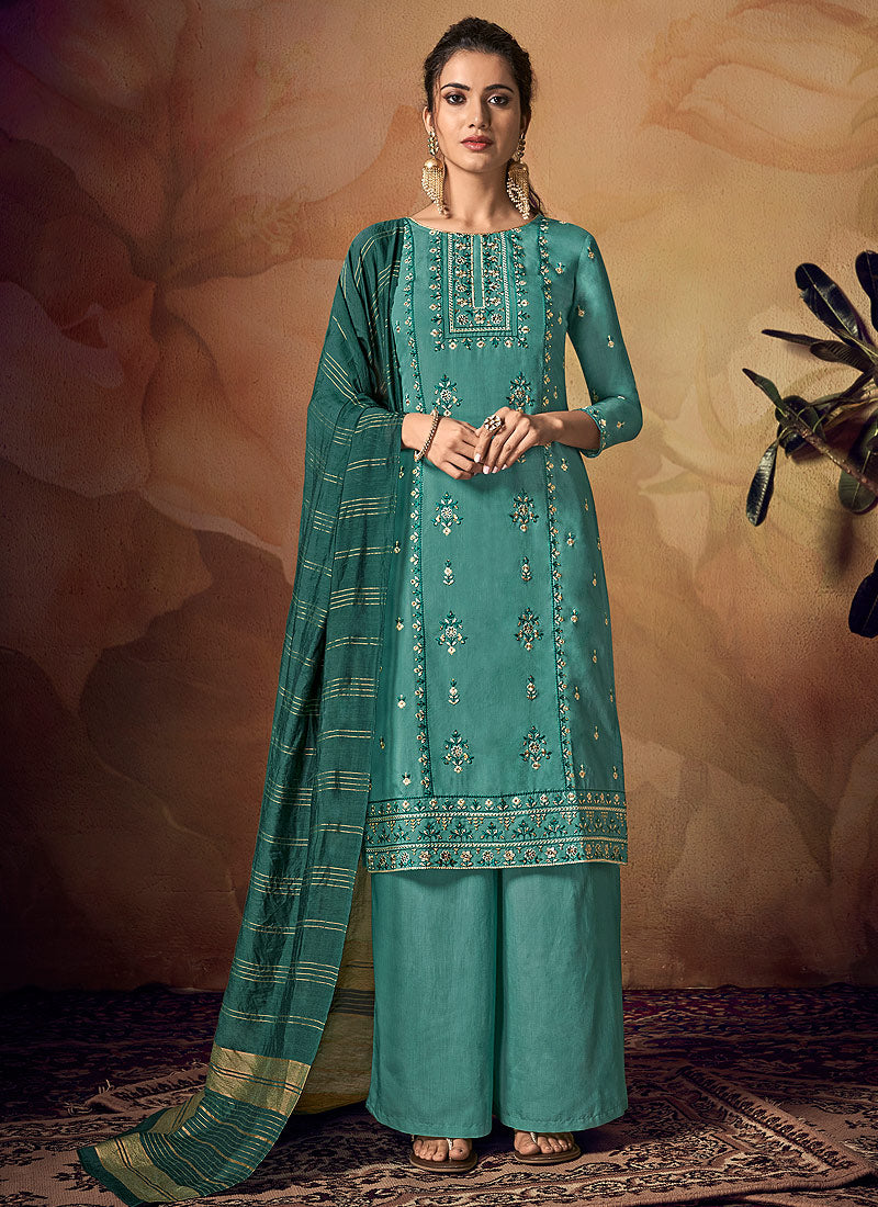 Turquoise Zari Embroidered Palazzo Suit is specially designed to complement your alluring beauty. This indian outfit comprises a beautiful traditional resham zari and thread embroidered on straight cut banarasi jacquard top paired with santoon palazzos pant bottom and inner and golden zari detailed banarasi silk dupatta. This suit set will go well with fancy golden jewellery and heels.