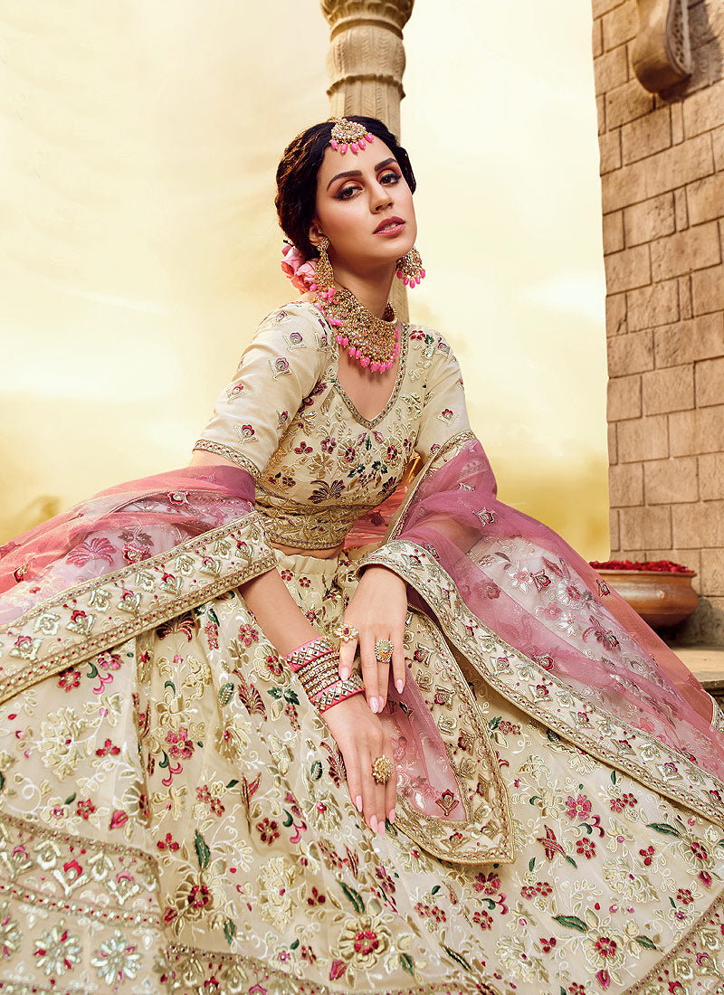 White And Pink Wedding Lehenga Choli In usa uk canada. Shop Latest Indian Clothes Collection Of White And Pink Wedding Lehenga Choli Online In Australia, Newzeland. This elegant set has a very pretty traditional embroidery detailed with gota patti, zari, zarkan and sequence work on georgette lehenga with satin lining paired with equally embellished georgette choli and ethnic embroidered soft net dupatta. Team this beautiful attire with classic pair of heels and golden jewellery to look like a diva.
