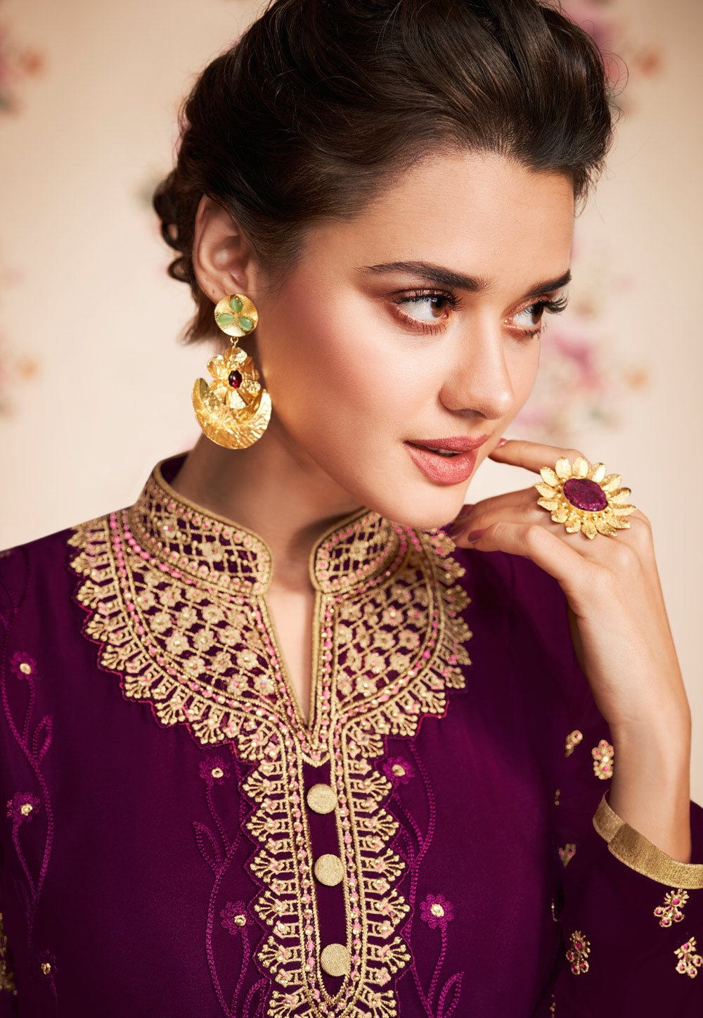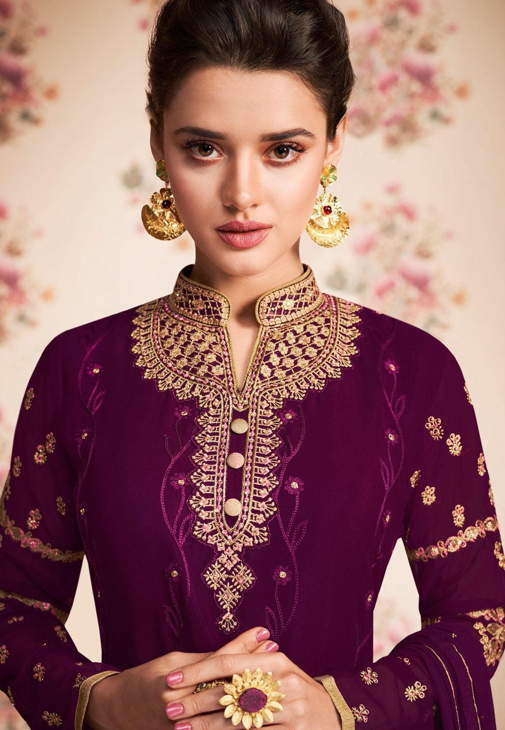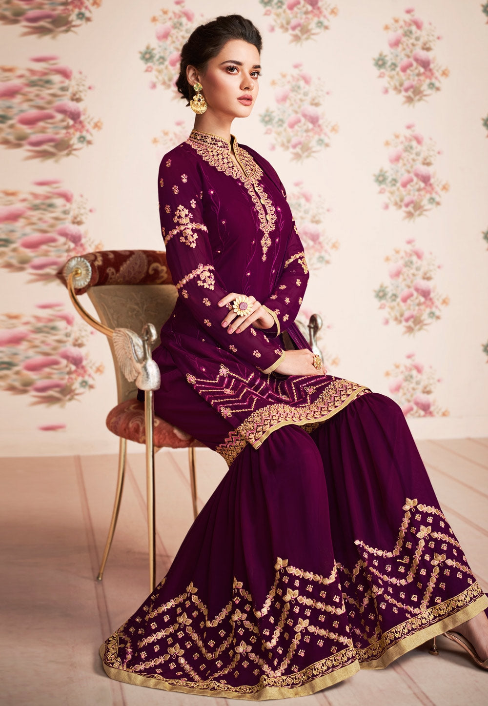 Wine Purple Embroidered Gharara Suit features a beautiful designer georgette top with delicate traditional embroidery with zari and resham machine work that goes amazingly with the hues of the dress. This set is paired with georgette bottom and satin inner and equally fascinating georgette dupatta. Team this beautiful attire with classic pair of heels and matching jewellery to look like a diva on this festival season or on any Wedding event.