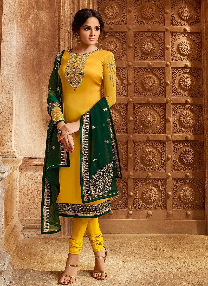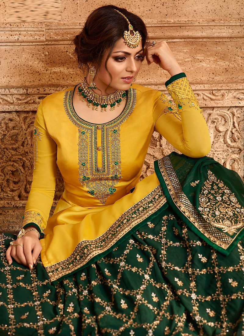 Yellow And Green Dual Bottom Lehenga/Pant Kurti Set is especially crafted for showcasing glamorous style and ethnic elegance with its unique embroidered combination of zari and resham thread work annotated perfectly on straight cut satin georgette top with santoon lining and flared georgette layered embroidered lehengha. This set also accompanies with matching santoon pant bottom and embroidered cut work net dupatta. Style it gracefully with studded earrings and stylish heels.