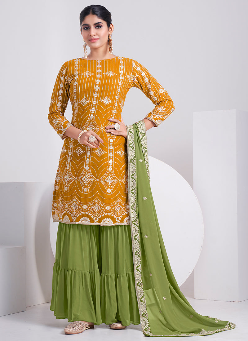 Yellow And Green Embroidery Festive Sharara Style Suit