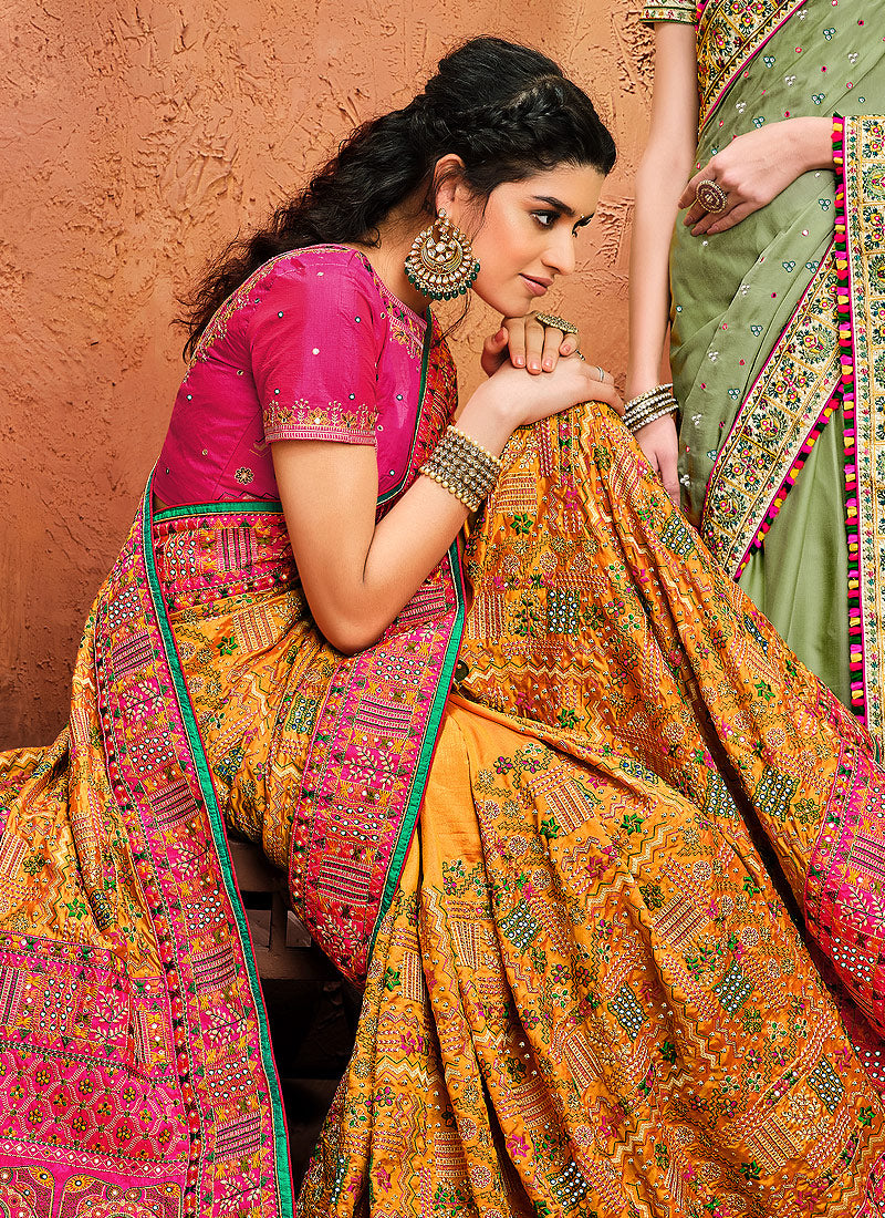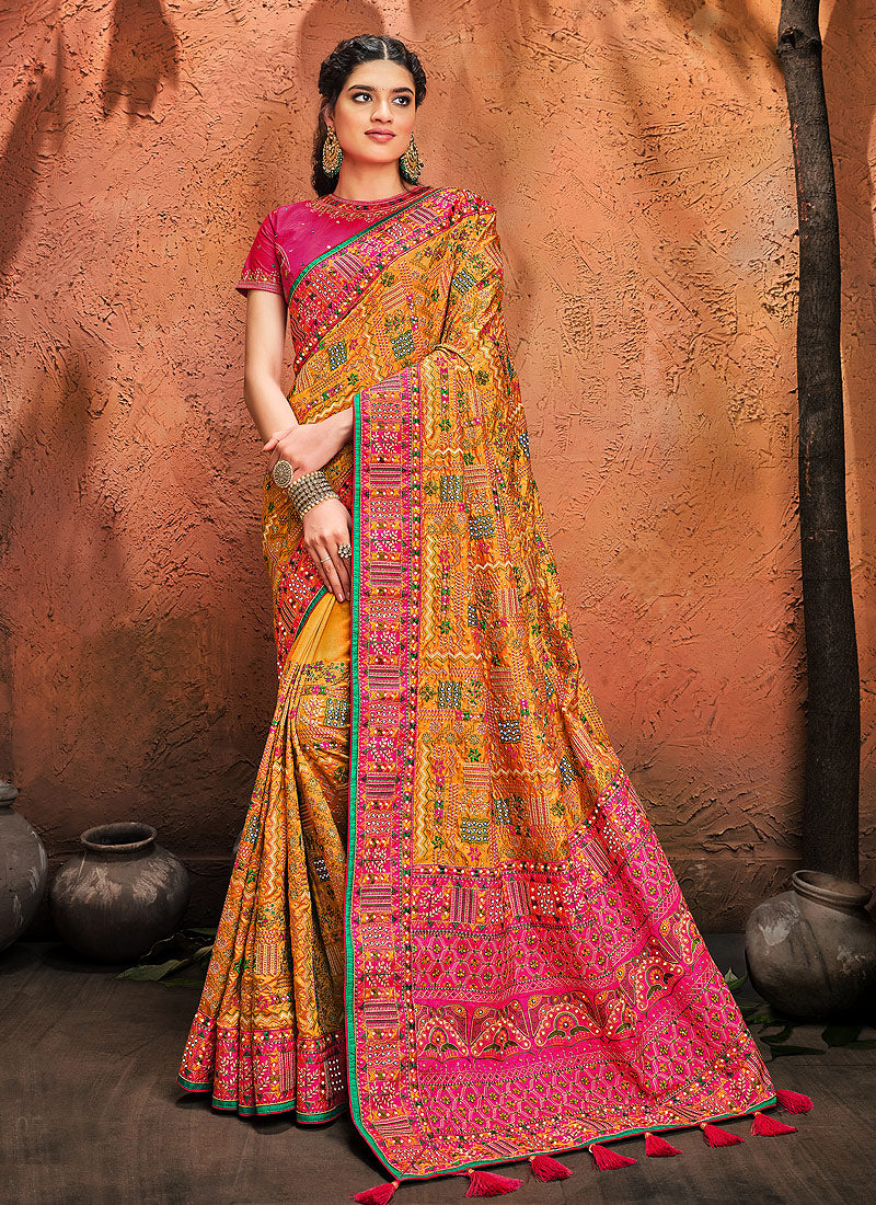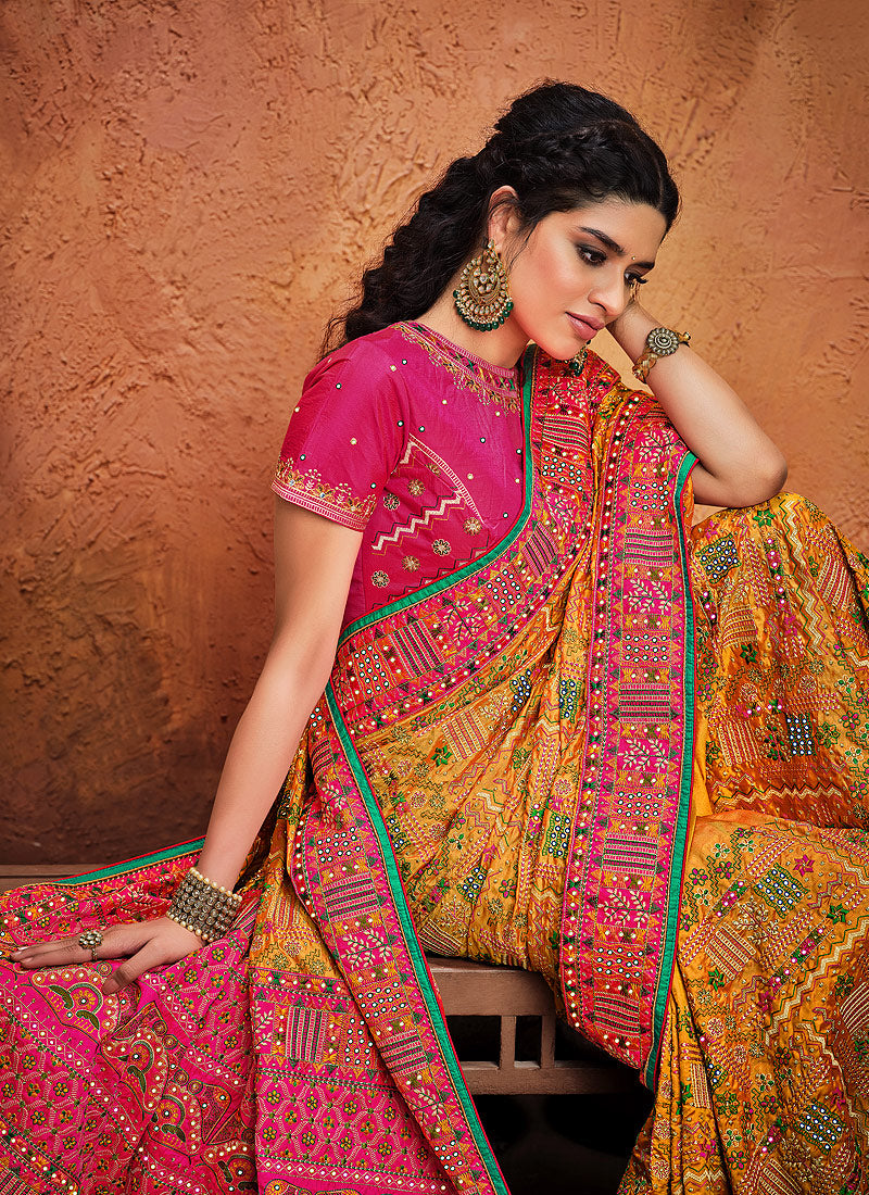 Yellow And Pink Multi Embroidered Designer Saree In usa uk canada Shop Latest Indian Saree Collection Of Yellow And Pink Multi Embroidered Designer Saree Online In Australia, Newzeland Indian wear with elegance and vibrant appealing with all the hues of multi embroidery work that has traditional touch embedded perfectly with zari, mirror work, zarkan and crystal stone embroidery motifs over pallu and daman on pure banarasi silk saree with contrasting equally embellished silk blouse. Drape this saree on fesitive parties or on wedding event with heels and statement jewellery to look like a diva.
