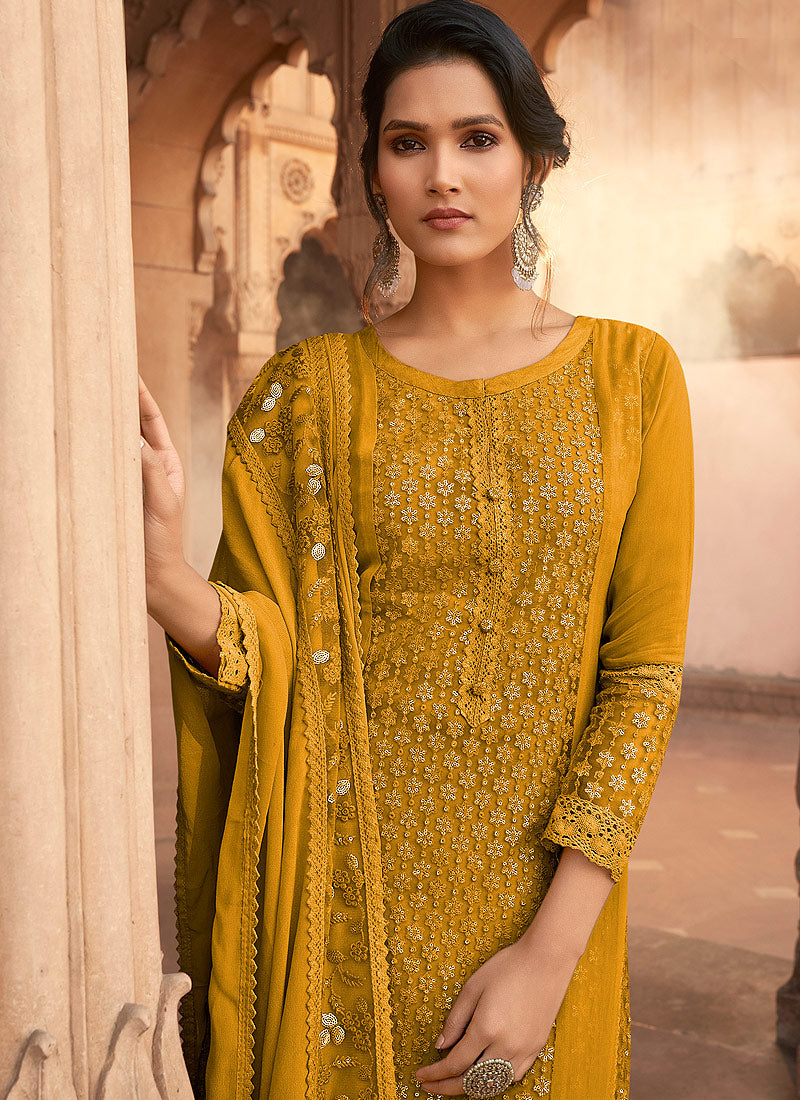 Yellow Designer Embroidered Palazzo Suit In usa uk canada Shop Latest Indian Clothes Collection Of Yellow Designer Embroidered Palazzo Suit Online In Australia, Newzeland. This elegant set is curated with designer crochet lace with hand work embroidery and zari work detail on straight cut double lined georgette top with designer motifs paired with beautifully embellished georgette palazzo bottom with santoon lining and pure georgette crochet lace and handwork embellished dupatta. Team this suit with basic heels and matching accessories to have a graceful look.