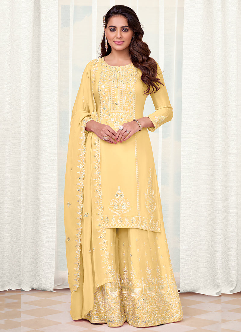 Yellow Designer Embroidery Festive Palazzo Suit is especially crafted for ethnic lovers. This set features traditional embroidery in combination of cording resham thread, zari and sequence work annotated perfectly on straight cut chinnon top paired with flared and embellished chinnon palazzo bottom with crape lining. This set also accompanies minimalist embroidery m enhanced chinnon dupatta. Style it gracefully on upcoming Eid festival with studded earrings and stylish heels.