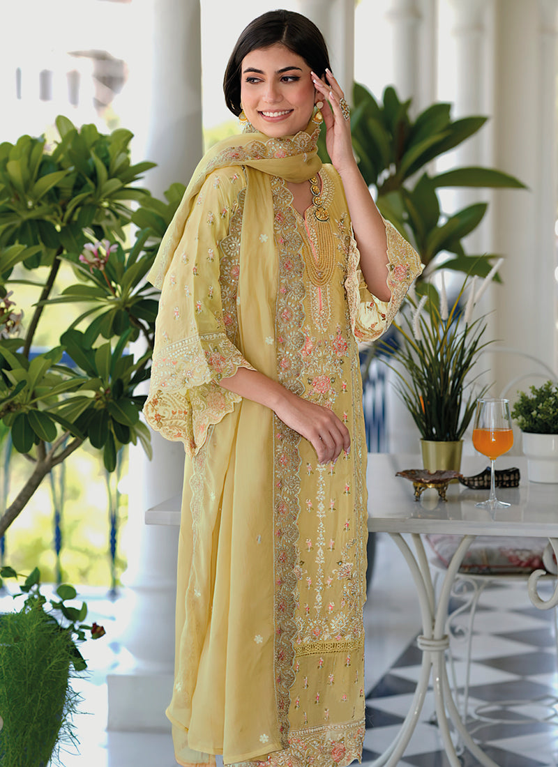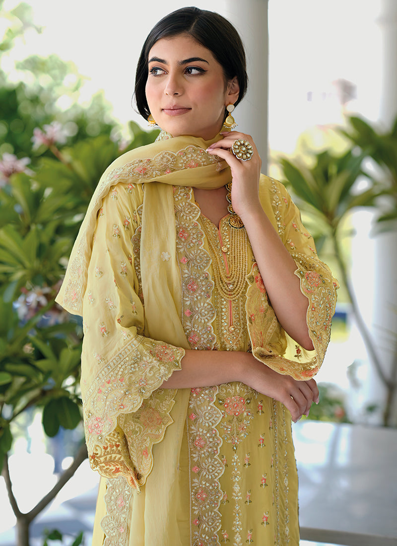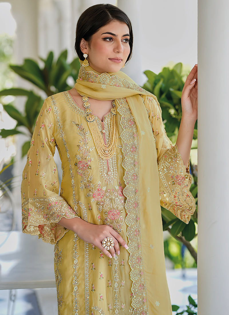 Yellow Zari Embroidery Traditional Pant Style Suit features elegant and stylish look for wedding and festivities. This set has all the traditional hues of traditional embroidery enhanced with resham thread, golden zari, badla and all over crystal stone on organza silk top paired with santoon pants bottom and lining. The unique part is it’s border embellished organza silk dupatta. Wear this with a pair of heels and traditional jewellery on this wedding season to have a desi girl look.