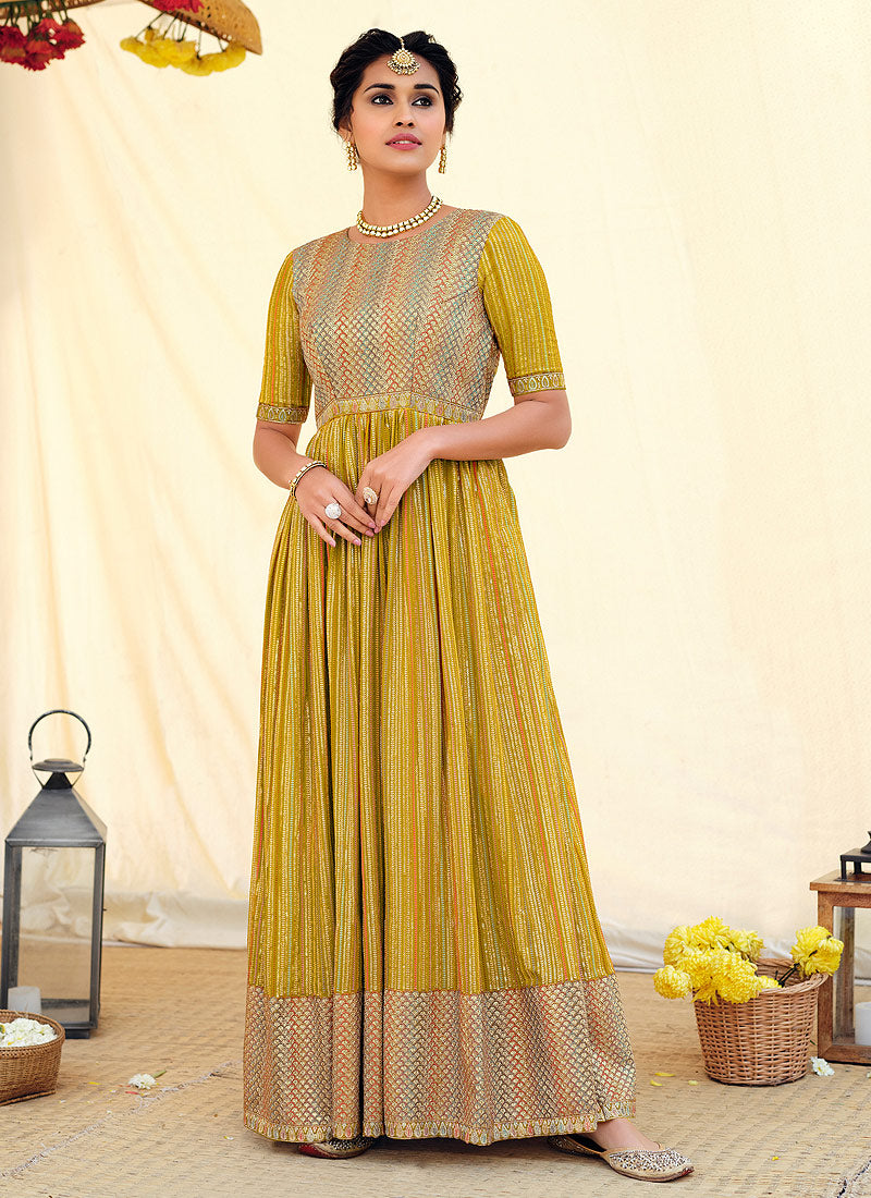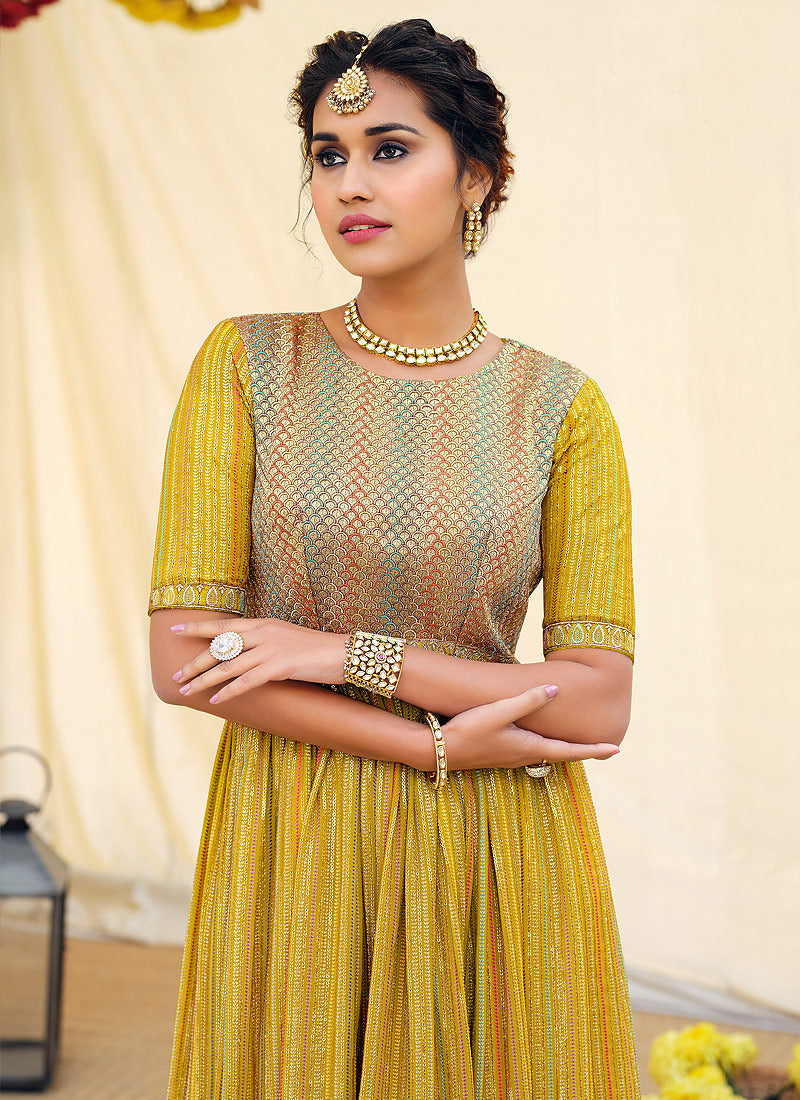 Yellow Golden Embroidered Designer Anarkali Suit Shop Latest Anarkali Suit In USA UK Canada With Free Shipping. features indian festive wear with ethnic motifs and detailed embroidery annotated beautifully with the combination of multi thread, zari and beads work on pure jacquard georgette anarkali gown paired with santoon bottom and minimalist lace detailed chiffon dupatta. Style this very pretty attire on this Eid festival with heels and golden jewellery to look stunningly beautiful from the rest of the crowd.