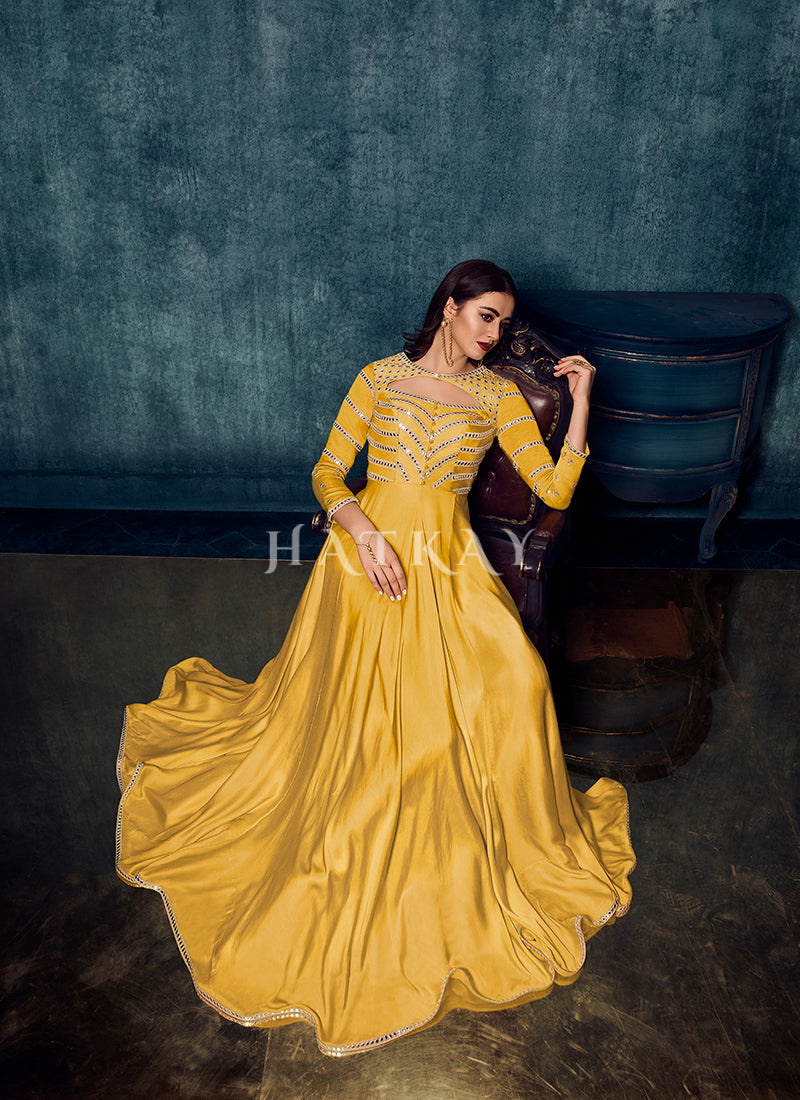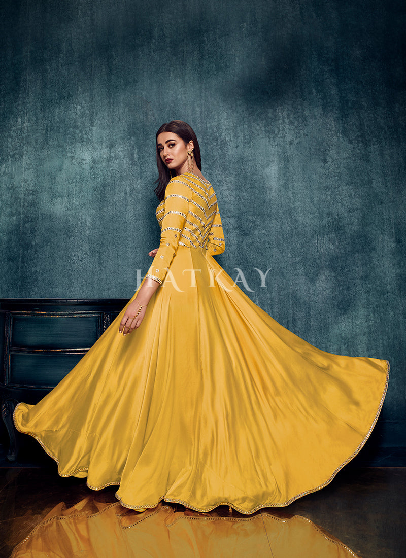 Yellow Mirror Embroidered Designer Gown designed for festive occasion or wedding parties. This set features intricate embroidery work with zari work and mirror embellishments detail on pure modal satin ethnic gown paired with lace border embellished chiffon dupatta. This designer attire will surely fetch you compliments for you glamorous sense of style. Team it up with golden jewellery and fancy clutch to look mesmerising.