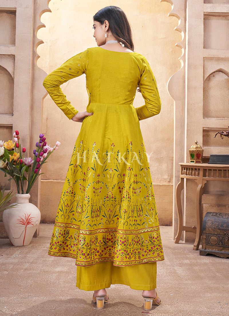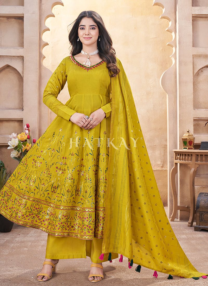 Yellow Mirror Work Anarkali Palazzo Suit features classic look for this festive season with all the ethnic hues of zari foil print, resham thread and mirror work embroidery on roman silk anarkali top paired with ghera solid satin silk palazzo bottom. The unique part is it’s heavy border enhanced roman silk dupatta. Wear this set with a pair of heels and golden jewellery to have a desi girl look.