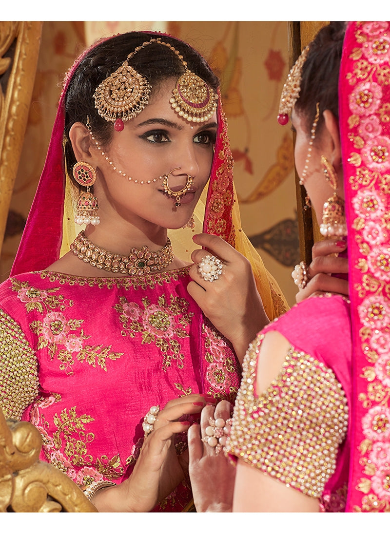 Yellow Tones With Pink Contrast Traditional Lehenga Choli Set is feminine, appealing and excellent pick for this Diwali festival or on any wedding function. This elegant set has a very pretty lucknowi and moti work embroidered flared net lehenga paired with equally embellished matching net choli and fascinating net dupatta. Team this beautiful attire with classic pair of heels and matching jewellery to look like a diva.